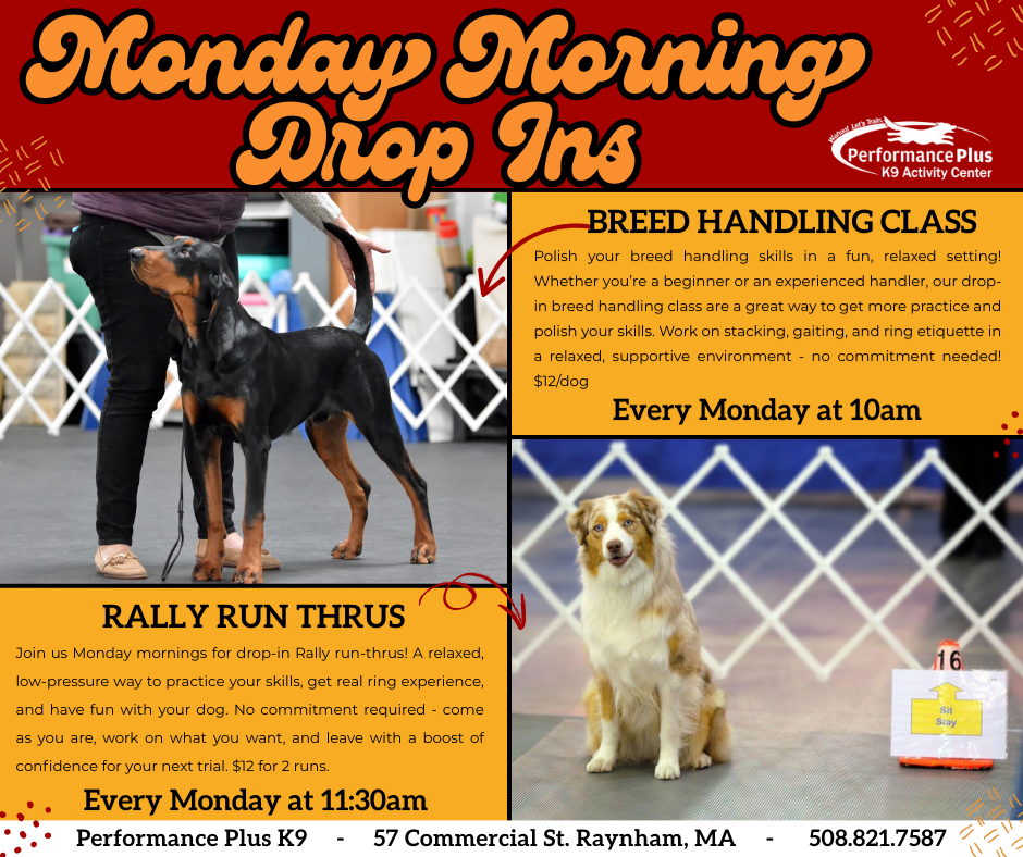 Perfect for beginners or advanced handlers looking to polish their skills. Work on stacking, gaiting, and ring etiquette in a relaxed, supportive environment. $12/dog