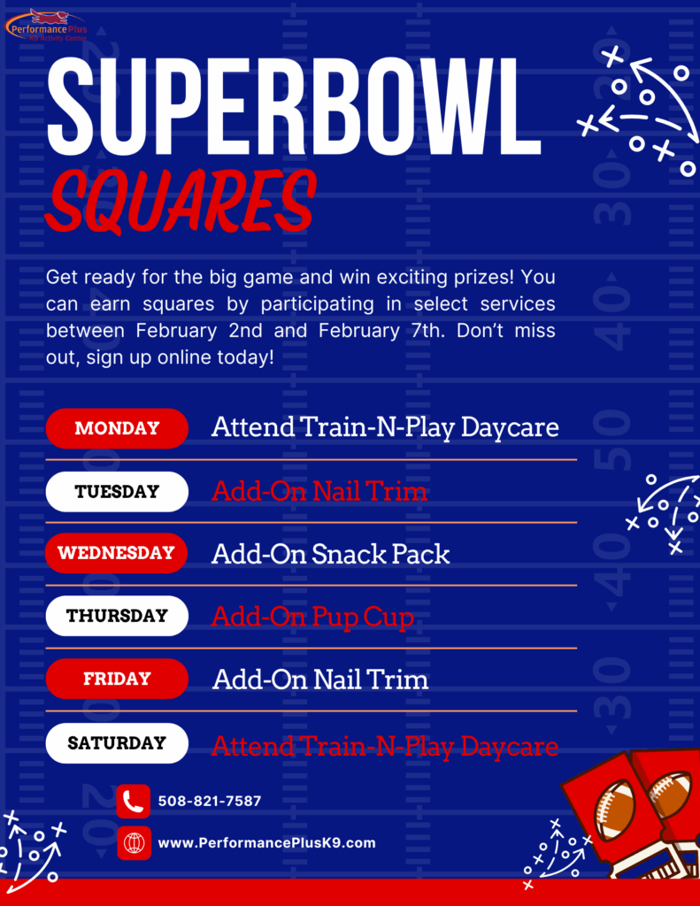 Get ready for the big game and win exciting prizes! You can earn squares by participating in select services between February 2nd and February 7th. You can earn a square each day! Squares will be posted Sunday morning. Prizes will be given out at the end of each quarter and a Grand Prize will be given out for final score!